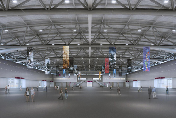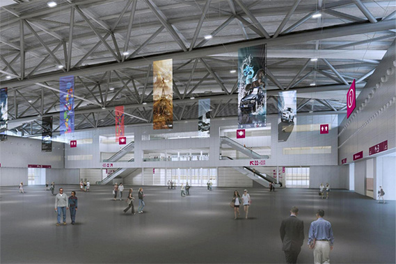 每个展厅2万平方米,均为单层、无柱结构,采用大跨度空间设计,净高16米。