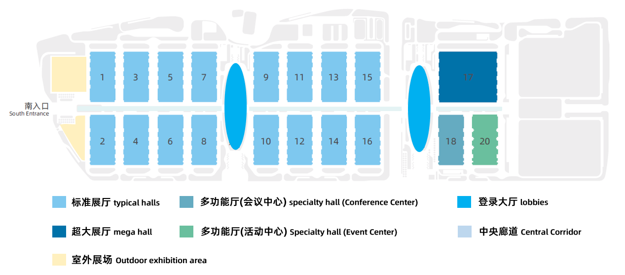 18、20号多功能展厅:面积2万平方米,净高16米。18号展厅为包含各种规模会议室的会议中心;20号展厅为活动中心。