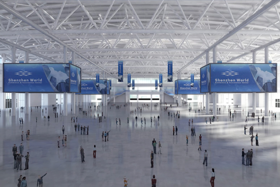 深圳国际会展中心的展览设施包括19个室内展厅和1个室外战场。室内展厅为16个标准展厅、1个超大展厅和2个多功能展厅,室外展场为南广场。